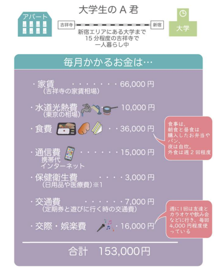 こちらのサイトによると一人暮らしに必要なのは一月で約15万円。